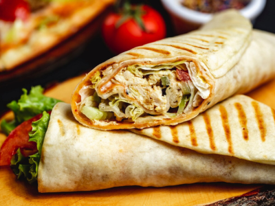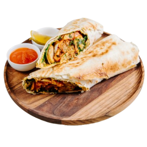 Juicy marinated chicken, perfectly grilled and wrapped in soft flatbread with fresh veggies and creamy sauce.
